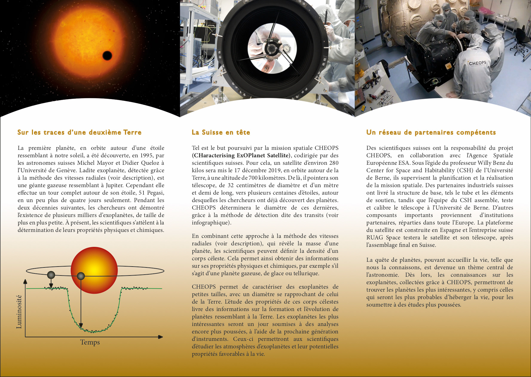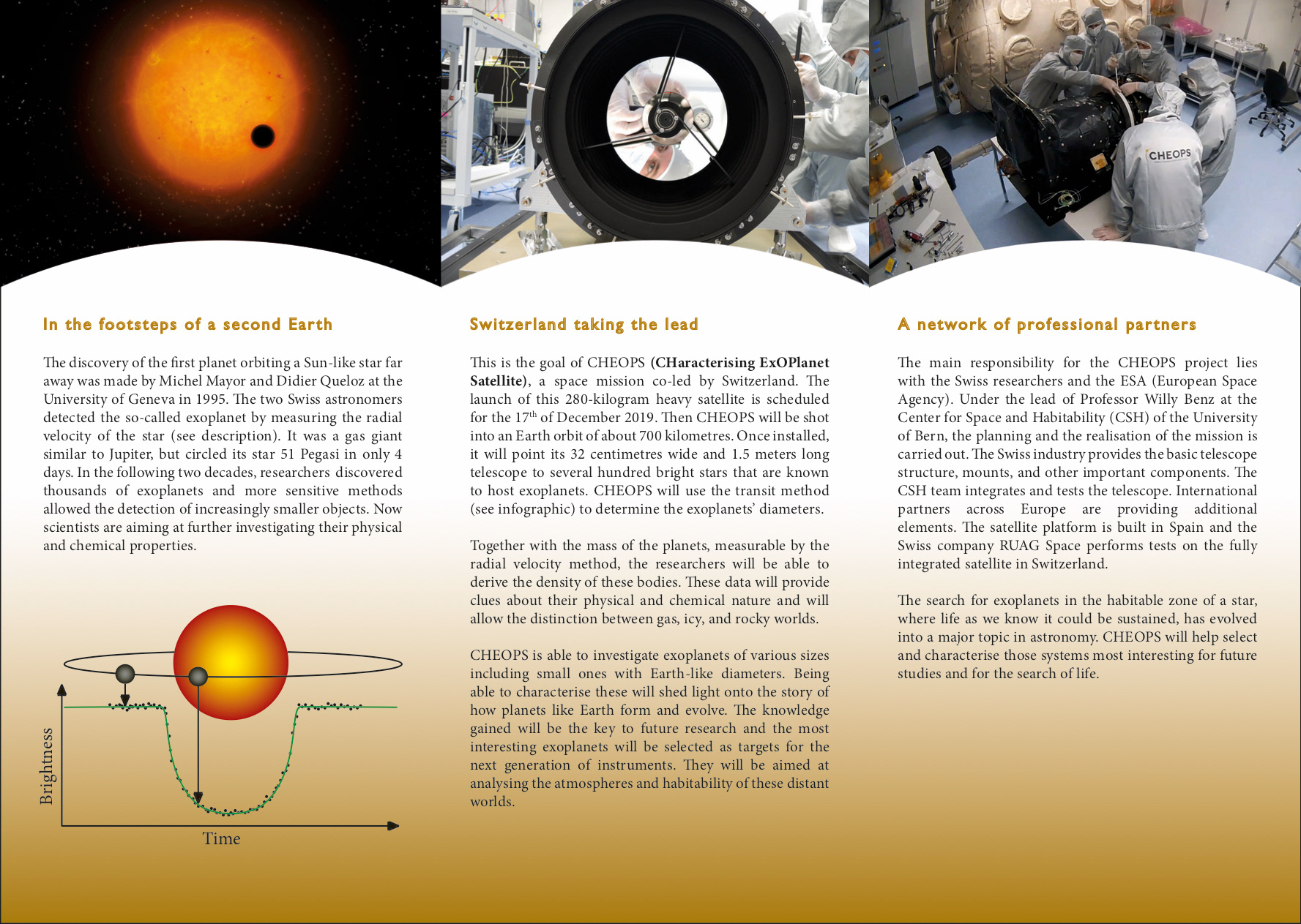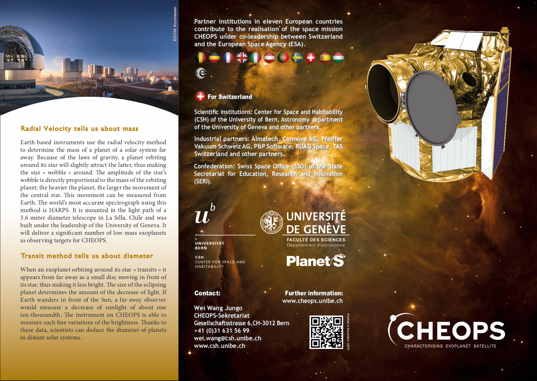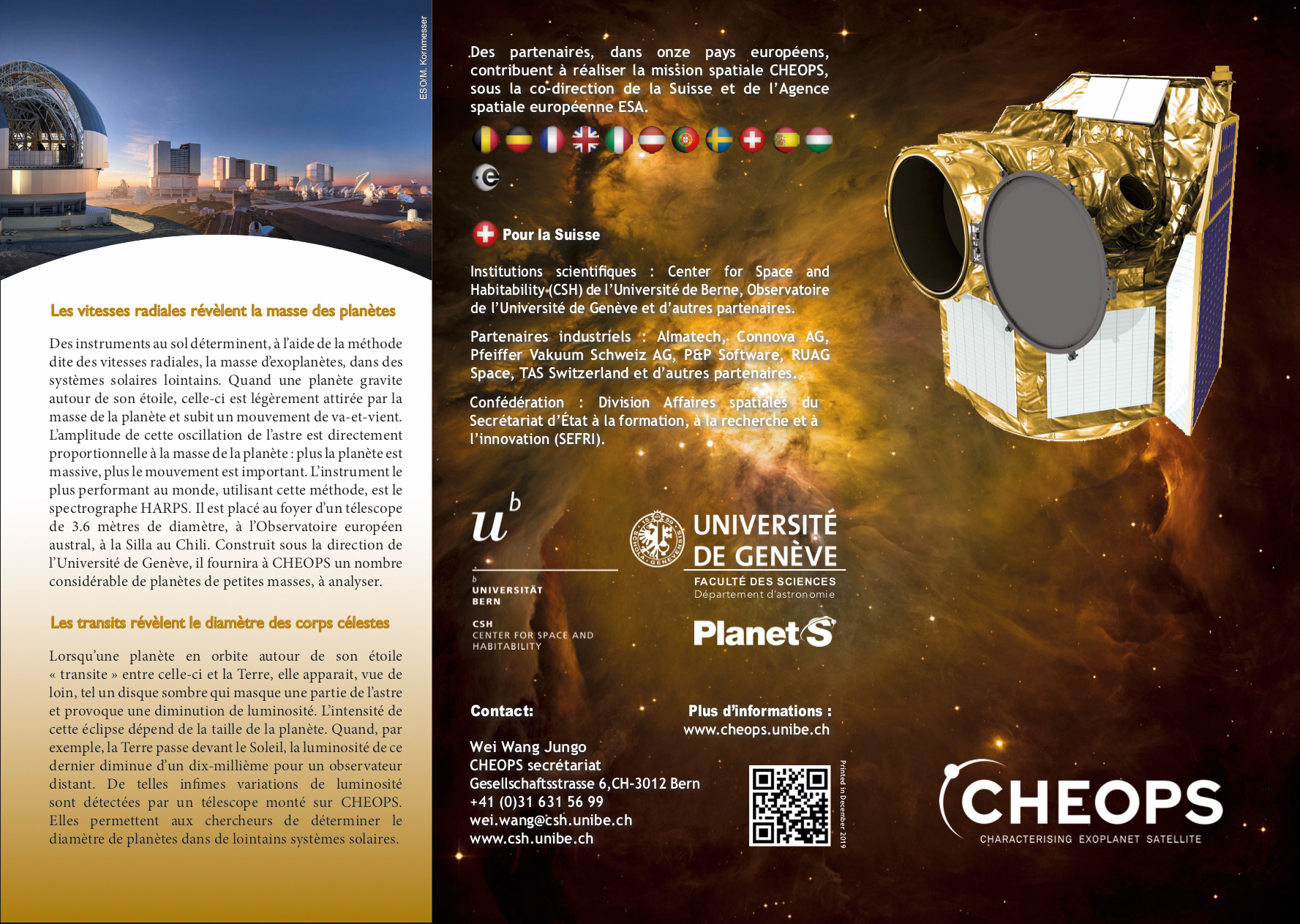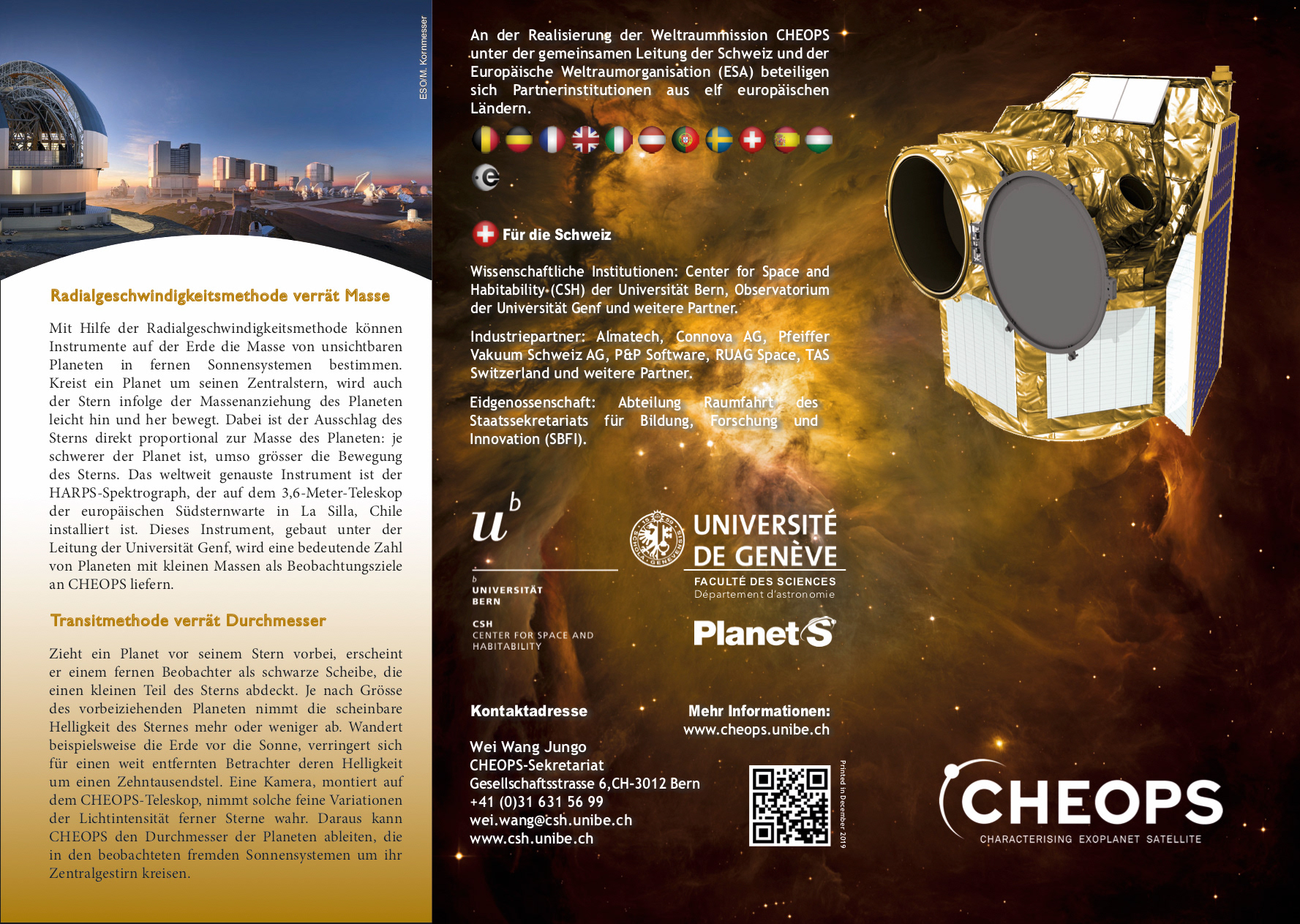 Tri-fold brochure for the satellite CHEOPS and the CSH institute (Bern)
